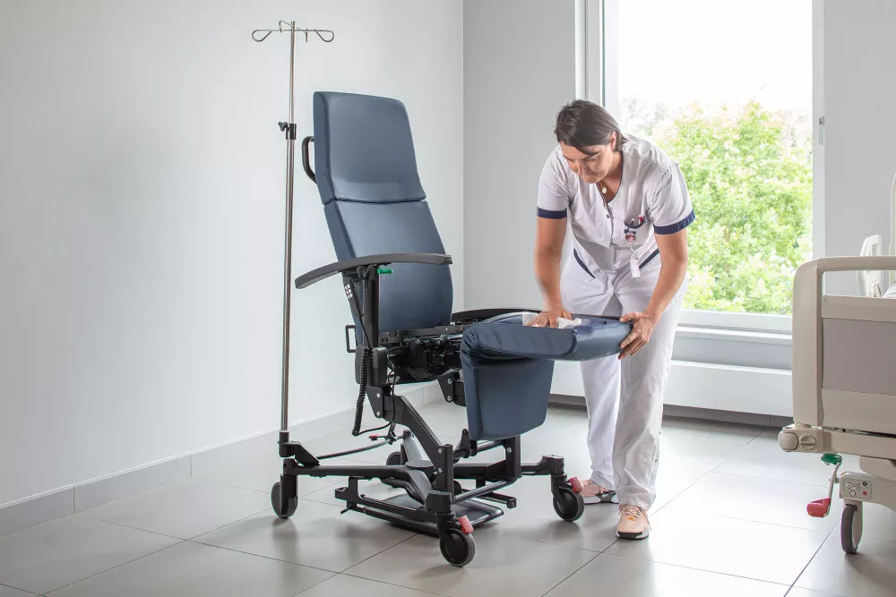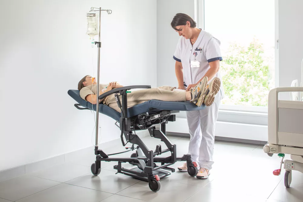 Pensé pour un usage intensif, le fauteuil Ino combine sécurité, hygiène et maniabilité. Ses différentes positions de soins et son système de transfert intuitif permettent de faciliter les examens, les soins quotidiens, le repos prolongé ou le passage vers le lit, tout en réduisant la pénibilité pour les équipes.